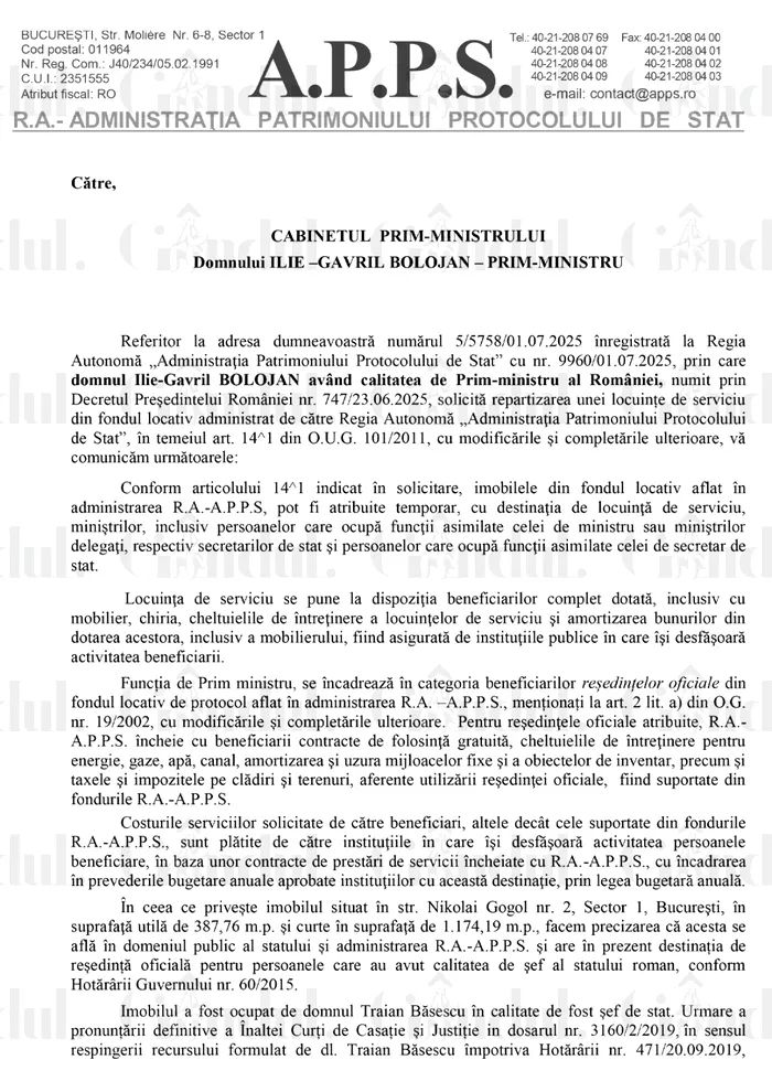 Tot joi, Gândul a publicat și dovada. RA-APPS l-a înștiințat direct pe premierul Bolojan, pe 29 iulie 2025, că „imobilul situat în str. Nikolai Gogol nr. 2, Sector 1, București, în suprafață utilă de 387,76 mp și curte în suprafață de 1.174,19 mp, se află în domeniul public al statului și administrarea R.A.-A.P.P.S. și are în prezent destinația de reședință oficială pentru persoanele care au avut calitatea de șef al statului român, conform Hotărârii Guvernului nr. 60/2015”.