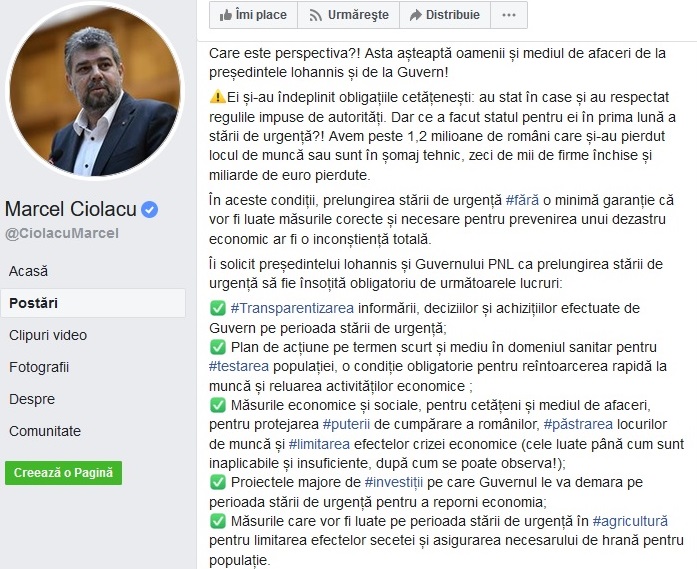 „Ei (n.r. oamenii) și-au îndeplinit obligațiile cetățenești: au stat în case și au respectat regulile impuse de autorități. Dar ce a facut statul pentru ei în prima lună a stării de urgență?! Avem peste 1,2 milioane de români care și-au pierdut locul de muncă sau sunt în șomaj tehnic, zeci de mii de firme închise și miliarde de euro pierdute. În aceste condiții, prelungirea stării de urgență #fără o minimă garanție că vor fi luate măsurile corecte și necesare pentru prevenirea unui dezastru economic ar fi o inconștiență totală”, scrie Marcel Ciolacu pe Facebook.