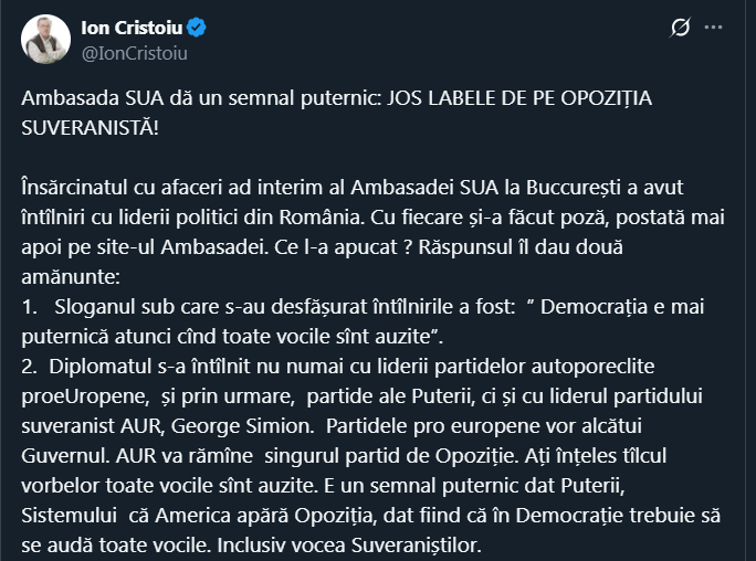 „Răspunsul îl dau două amănunte: 1. Sloganul sub care s-au desfășurat întâlnirile a fost: ” Democrația e mai puternică atunci când toate vocile sunt auzite”. 2. Diplomatul s-a întâlnit nu numai cu liderii partidelor autoporeclite pro-europene, și prin urmare, partide ale Puterii, ci și cu liderul partidului suveranist AUR, George Simion”, afirmă Cristoiu, scriitor și publicist.