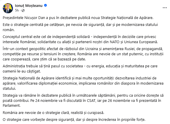Ministrul Ionuț Moșteanu a declarat despre Strategia de Apărare, prezentată de președintele Nicușor Dan, că este „centrată pe cetățean”, dar și pe solidaritatea cu aliații NATO și Uniunea Europeană.