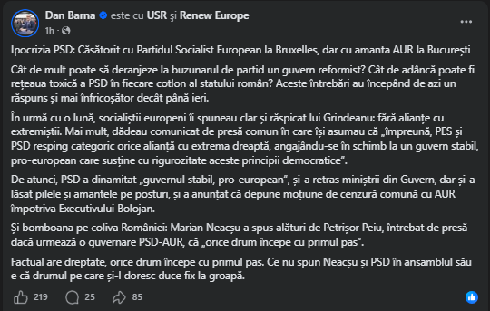 Dan Barna, europarlamentar al USR, critică Partidul Social Democrat, pe motiv că a colaborat cu AUR pe moțiunea de cenzură împotriva lui premierului Bolojan. Amintim că tot Barna este cel care a semnat moțiunea AUR pentru demiterea guvernului Cîțu în 2021, pe vremea când era președintele USR Plus.