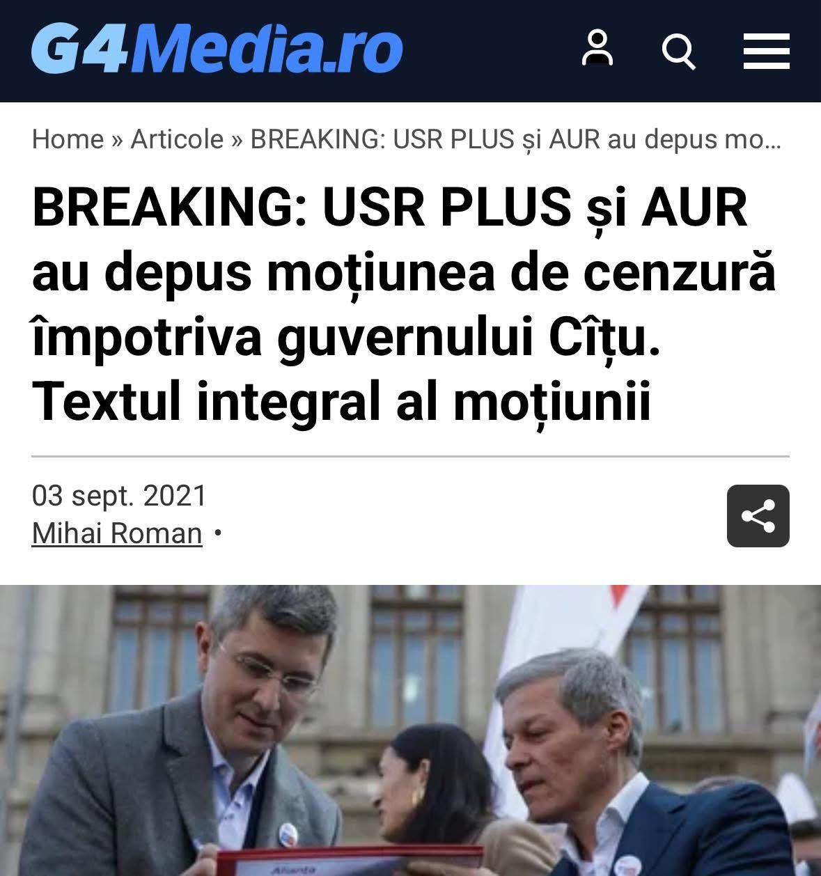În septembrie 2021, Dan Barna, lider USR Plus, a susținut moțiunea de cenzură inițiativa AUR împotriva fostului premier Florin Cîțu.