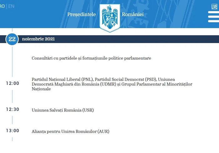 Șeful statului susține luni, de la ora 14:00, o declarație de presă ducă ce a condus, începând cu ora 12:00, consultări cu partidele parlamentare pentru desemnarea unui candidat pentru funcția de premier, care sa propună un Cabinet și un program de guvernare cu susținere majoritară în Parlament. PNL, PSD, UDMR și minoritățile naționale au mers împreună la întâlnirea cu Klaus Iohannis, USR a anunțat că nu participă, iar a ultima formațiune de pe agendă este AUR.