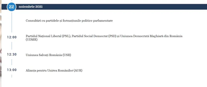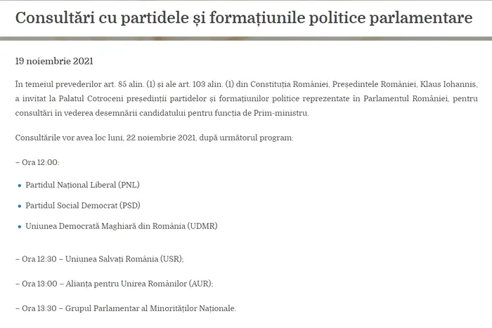 Klaus Iohannis a convocat consultările cu partidele și formațiunile politice parlamentare pentru formarea unui nou Executiv, după ce Cabinetul Cîțu a fost demis în Parlament, prin moțiune de cenzură, în 5 octombrie.