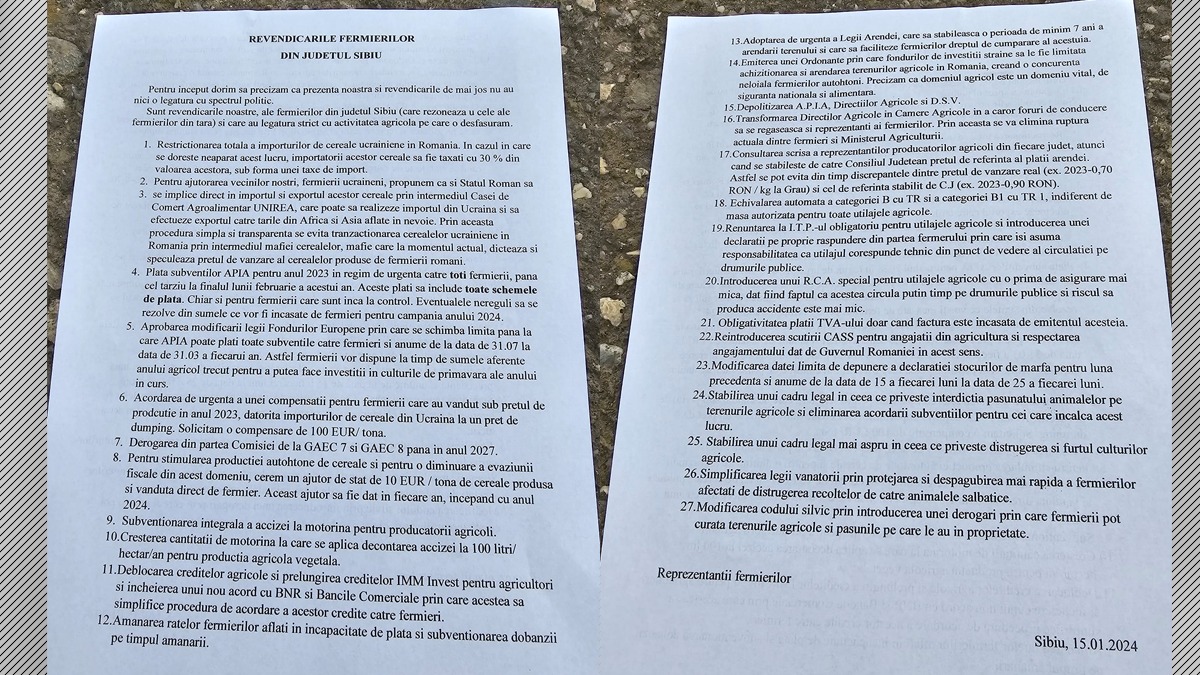 27 de revendicări au fermierii din Sibiu, potrivit unui documentat cu data de luni, 15 ianuarie. Aceștia cer „restricționarea totală a importului de cereale ucrainene în România”.