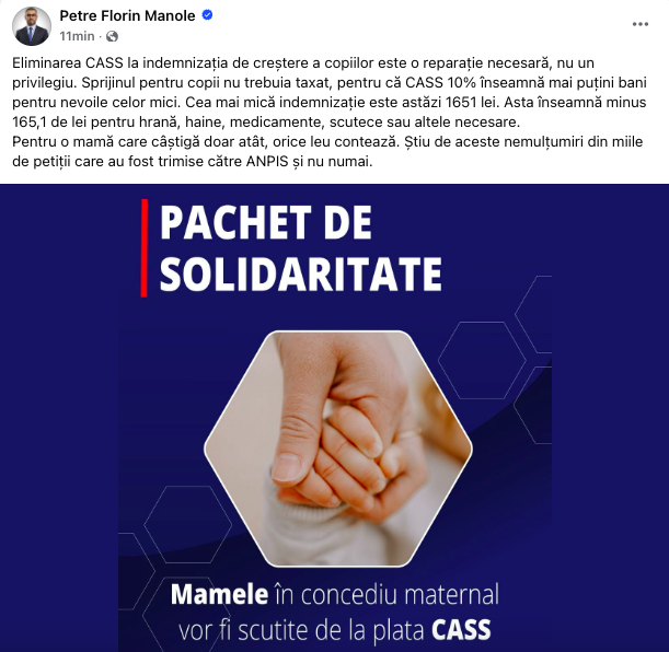 Florin Manole a precizat că scutirea de la plata CASS pentru părinții aflați în concediu de creștere a copilului ar viza peste 147.000 de persoane. Impactul bugetar estimat este de aproximativ 560 de milioane de lei, sumă care ar reprezenta bani pe care statul nu i-ar mai încasa.