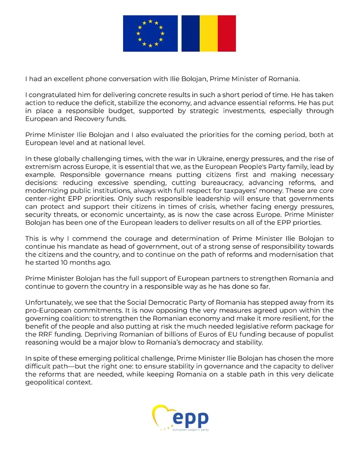„Premierul Bolojan are sprijinul deplin al partenerilor europeni pentru a consolida România și a continua să guverneze țara într-un mod responsabil”, mai scrie Manfred Weber.