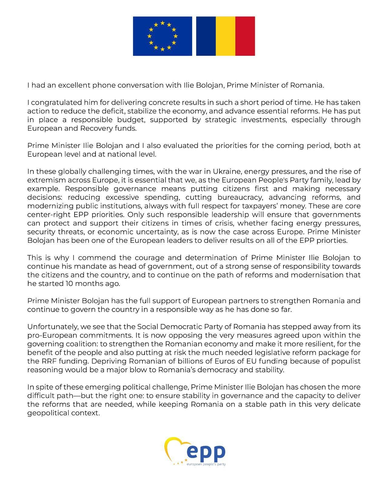 Liderul PPE a apreciat că Ilie Bolojan „a fost unul dintre liderii europeni care a obținut rezultate în toate prioritățile PPE” și a salutat „curajul și determinarea” acestuia de a continua reformele începute.