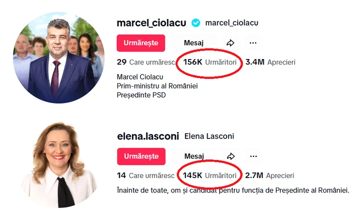 Marcel Ciolacu a reușit să o întreacă, la un moment dat, pe Lasconi, ajungând la un total de 146.373 de urmăritori, cu peste 1.300 mai mult decât cei 145.052 de urmăritori ai Elenei Lasconi. Mai mult, diferența s-a mărit considerabil, contul lui Marcel Ciolacu atingând în prezent 156.000 de urmăritori, în timp ce Elena Lasconi are tot puțin peste 145.000 de urmăritori (vezi GALERIA FOTO).
