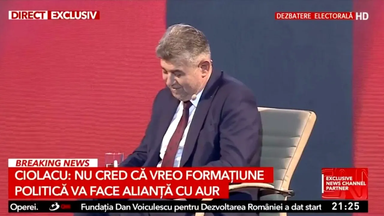 Într-o intervenție televizată la dezbaterea organizată de Antena 3 CNN, Marcel Ciolacu a subliniat că PSD nu va face alianță cu AUR, chiar dacă acest lucru ar putea duce la trecerea social-democraților în opoziție.