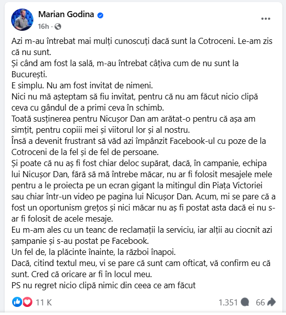„Însă a devenit frustrant să văd azi împânzit Facebook-ul cu poze de la Cotroceni de la fel și de fel de persoane. Și poate că nu aș fi fost chiar deloc supărat, dacă, în campanie, echipa lui Nicușor Dan, fără să mă întrebe măcar, nu ar fi folosit mesajele mele pentru a le proiecta pe un ecran gigant la mitingul din Piața Victoriei sau chiar într-un video pe pagina lui Nicușor Dan. Acum, mi se pare că a fost un oportunism grețos și nici măcar nu aș fi postat asta dacă ei nu s-ar fi folosit de acele mesaje”.