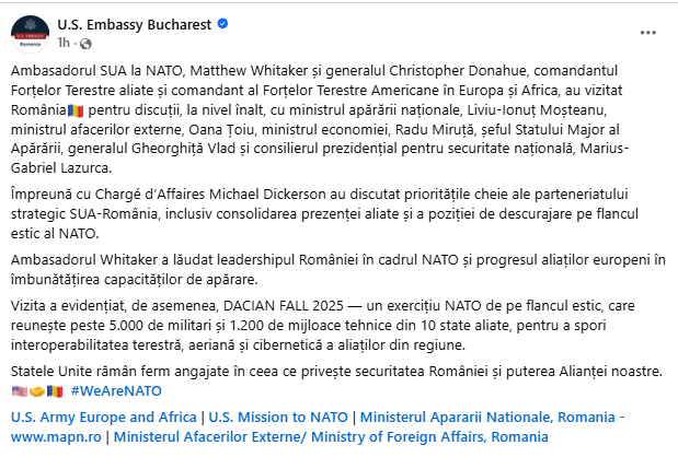 „Ambasadorul Whitaker a lăudat leadershipul României în cadrul NATO și progresul aliaților europeni în îmbunătățirea capacităților de apărare”, se arată în mesajul publicat pe Facebook de către Ambasada SUA din București.