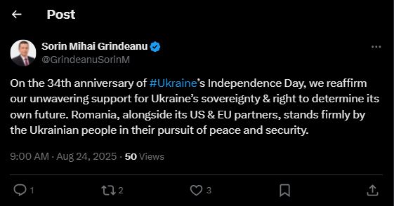 De altfel, Nicușor Dan, președintele României, a transmis și el un mesaj de Ziua Independenței Ucrainei (24 august). Președintele României a transmis cetățenilor ucraineni „cele mai calde felicitări şi urările mele sincere de pace şi securitate”. Totodată, șeful statului a reiterat în mesaj sprijinul acordat de statul român pentru „efortul legitim al Ucrainei de a se apăra”.