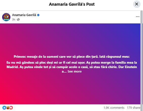 „Primesc mesaje de la oameni care vor să plece din ţară. Iată răspunsul meu: Eu nu mă gândesc să plec deşi mi-ar fi cel mai uşor. Aş putea merge la familia mea la Madrid. Aş putea vinde tot şi să cumpăr acolo o casă, să stau fără chirie. Dar Einstein a spus că dacă ai privilegiul să vezi, ai datoria să acţionezi. Noi suntem cei cărora ne-a dat Dumnezeu privilegiul să vedem, deci avem datoria să acţionăm. Nu să fugim. Şi ştiu că Dumnezeu va fi cu noi”, este mesajul notat de Anamaria Gavrilă, pe rețelele de socializare. Iată dovada mai jos.