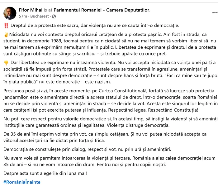 „Nu poți cere respect pentru valorile democratice și, în același timp, să instigi la violență și să ameninți instituțiile care garantează ordinea și legalitatea. Violența distruge democrația. De 35 de ani îmi exprim voința prin vot, ca simplu cetățean. Și nu voi putea niciodată accepta ca viitorul acestei țări să fie dictat prin forță și frică. Democrația se construiește prin dialog, respect și vot, nu prin ură și amenințări. Nu avem voie să permitem întoarcerea la violență și teroare. România a ales calea democrației acum 35 de ani – și nu ne vom întoarce din drum. Pentru noi și pentru copiii noștri. Despre asta sunt alegerile din luna mai!”.