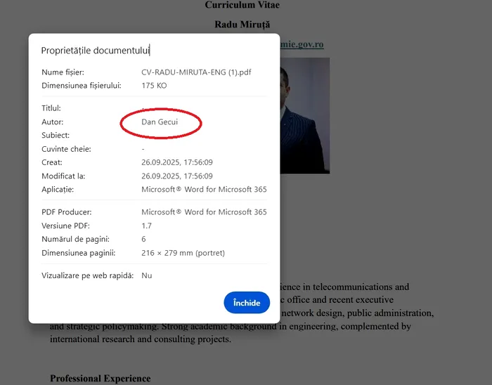 Radu Miruță, ministrul Economiei, cel care a preluat interimatul la șefia Ministerului Apărării, după demisia lui Ionuț Moșteanu, prezintă, în mod ironic, anumite inadvertențe în CV. Neregulile nu au legătură cu studiile absolvite, ci cu faptul că persoana care a redactat CV-ul lui Miruță nu are nicio funcție în Ministerul Economiei, fapt ce scoate la iveală „o afacere de familie” la nivelul unei instituții de stat, în care este implicată consiliera și soțul acesteia. Pe metadatele documentului încărcat pe site-ul Ministerului Economiei, apare o supriză: autorul CV-ului lui Miruță ar fi „Dan Gecui” care este soțul Ioanei Răduca, șefa de cabinet a ministrului. Radu Miruță este, în acest moment, și ministru interimar al Apărării, după demisia lui Ionuț Moșteanu.