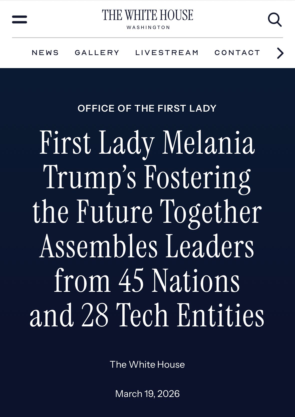 Agenda include o sesiune de lucru la Departamentul de Stat al SUA (24 martie) și o reuniune la nivel înalt la Casa Albă (25 martie), cu participarea Primelor Doamne și a reprezentanților statelor implicate, axate pe educație digitală, utilizarea tehnologiei și protecția copiilor în mediul online.