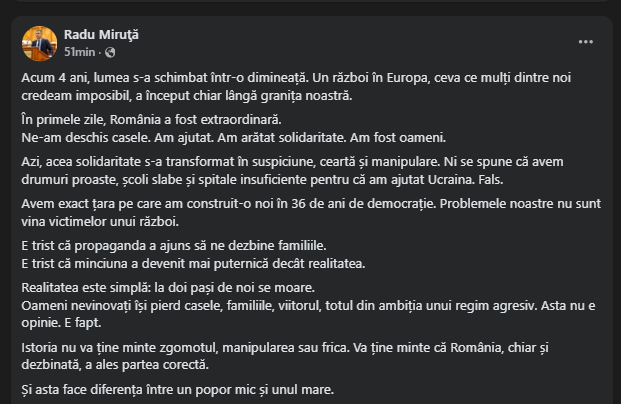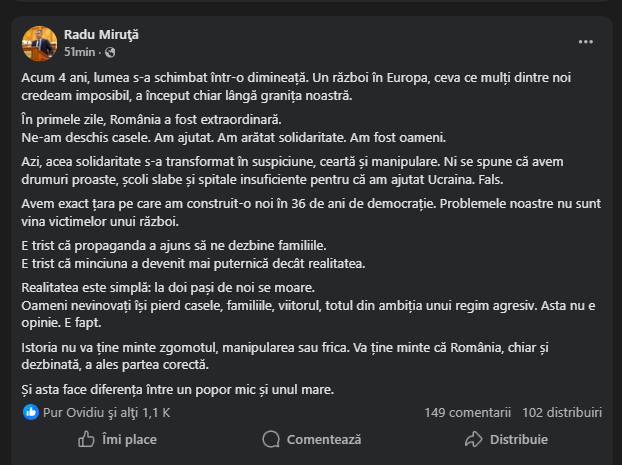 Ministrul Apărării, Radu Miruță, a transmis un mesaj la patru ani de la izbucnirea războiului din Ucraina, în care critică adversarii politici pentru răspândirea unei așa-zise „propagande”.