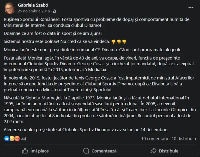 Rușinea Sportului Românesc! Fosta sportivă cu probleme de dopaj și comportament numită de Ministerul de Interne să conducă clubul Dinamo! Doamne, ce am fost odată în sport și ce am ajuns! Sistemul nostru este bolnav! Nu cred ca se va vindeca, a scris pe Facebook Gabriela Szabo.