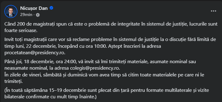Președintele Nicușor Dan, pe de altă parte, consideră că o astfel de situație, care a zdruncinat justiția română, mai poate aștepta. Liderul de la Cotroceni a transmis magistraților un mesaj pe Facebook, în care i-a anunțat că îi invită la o discuție la Cotroceni pe 22 decembrie.