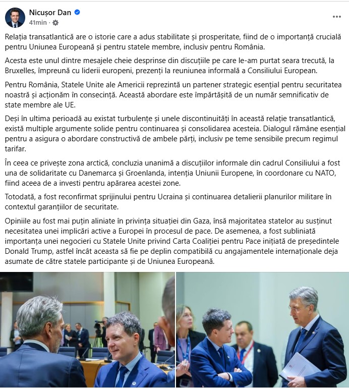 Acesta este unul dintre mesajele cheie desprinse din discuțiile pe care le-am purtat seara trecută, la Bruxelles, împreună cu liderii europeni, prezenți la reuniunea informală a Consiliului European. Pentru România, Statele Unite ale Americii reprezintă un partener strategic esențial pentru securitatea noastră și acționăm în consecință. Această abordare este împărtășită de un număr semnificativ de state membre ale UE”, a scris șeful statului pe pagina sa de Facebook.