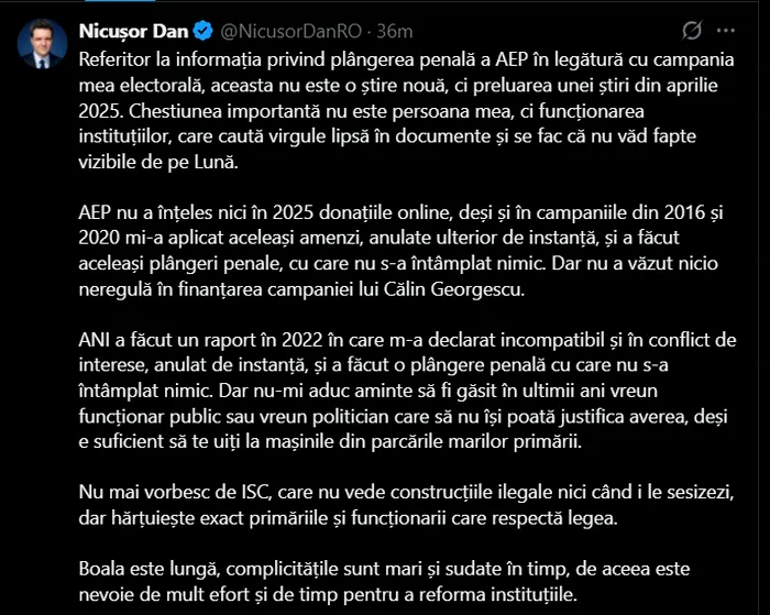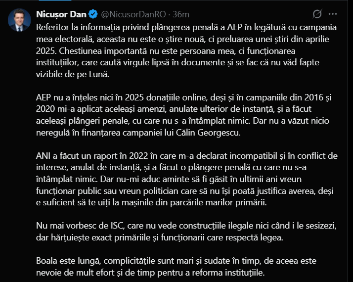 „Referitor la informația privind plângerea penală a AEP în legătură cu campania mea electorală, aceasta nu este o știre nouă, ci preluarea unei știri din aprilie 2025.