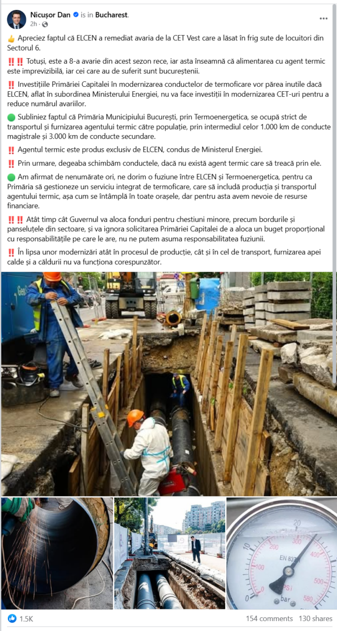 „Totuşi, este a 8-a avarie din acest sezon rece, iar asta înseamnă că alimentarea cu agent termic este imprevizibilă, iar cei care au de suferit sunt bucureştenii. Investiţiile Primăriei Capitalei în modernizarea conductelor de termoficare vor părea inutile dacă ELCEN, aflat în subordinea Ministerului Energiei, nu va face investiţii în modernizarea CET-uri pentru a reduce numărul avariilor. Agentul termic este produs exclusiv de ELCEN, condus de Ministerul Energiei. Prin urmare, degeaba schimbăm conductele, dacă nu există agent termic care să treacă prin ele”, a raportat primarul general al Capitalei, Nicuşor Dan.