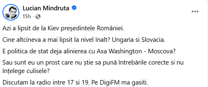 „Azi a lipsit de la Kiev președintele României. Cine altcineva a mai lipsit la nivel înalt? Ungaria si Slovacia. E politica de stat deja alinierea cu Axa Washington – Moscova? Sau sunt eu un prost care nu știe sa pună întrebările corecte si nu înțelege culisele? (…)”, a scris Lucian Mândruță pe pagina sa de Facebook.