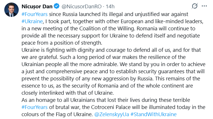 Patru ani de când Rusia a început războiul său ilegal și nejustificat împotriva Ucrainei, am participat, alături de alți lideri europeni și cu aceleași viziuni, la o nouă reuniune a Coaliției de Voință. România va continua să ofere tot sprijinul necesar Ucrainei pentru a se apăra și a negocia pacea dintr-o poziție de forță.
