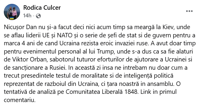 „Nicușor Dan nu și-a facut deci nici acum timp să meargă la Kiev, unde se aflau liderii UE și NATO și o serie de șefi de stat si de guvern pentru a marca 4 ani de când Ucraina rezista eroic invaziei ruse. A avut doar timp pentru evenimentul personal al lui Trump, unde s-a dus ca să fie alături de Viktor Orban, sabotorul tuturor eforturilor de ajutorare a Ucrainei și de sancționare a Rusiei. În această zi, însă, ne întrebăm nu doar cum a trecut presedintele testul de moralitate și de inteligență politică reprezentat de războiul din Ucraina, ci țara noastră în ansamblu (…)”, a scris jurnalista Rodica Culcer în mediul online.