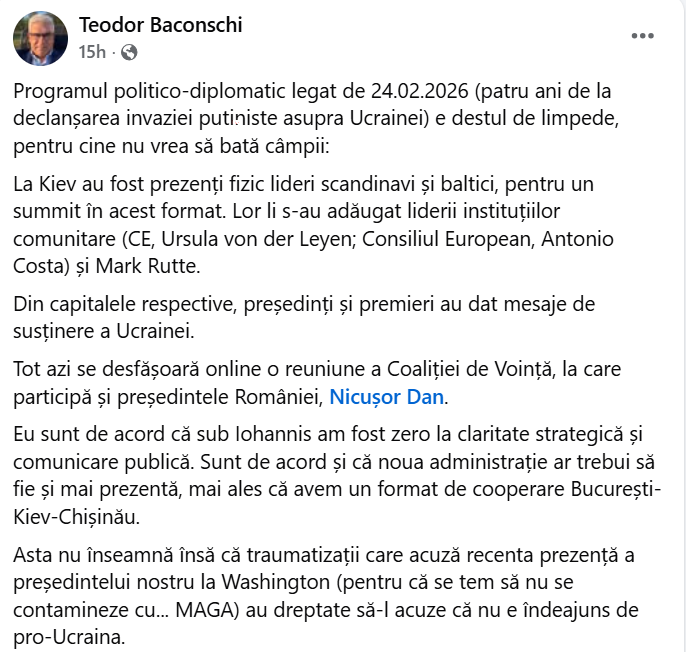 Asta nu înseamnă însă că traumatizații care acuză recenta prezență a președintelui nostru la Washington (pentru că se tem să nu se contamineze cu… MAGA) au dreptate să-l acuze că nu e îndeajuns de pro-Ucraina”, a scris Teodor Baconski pe pagina sa de socializare.