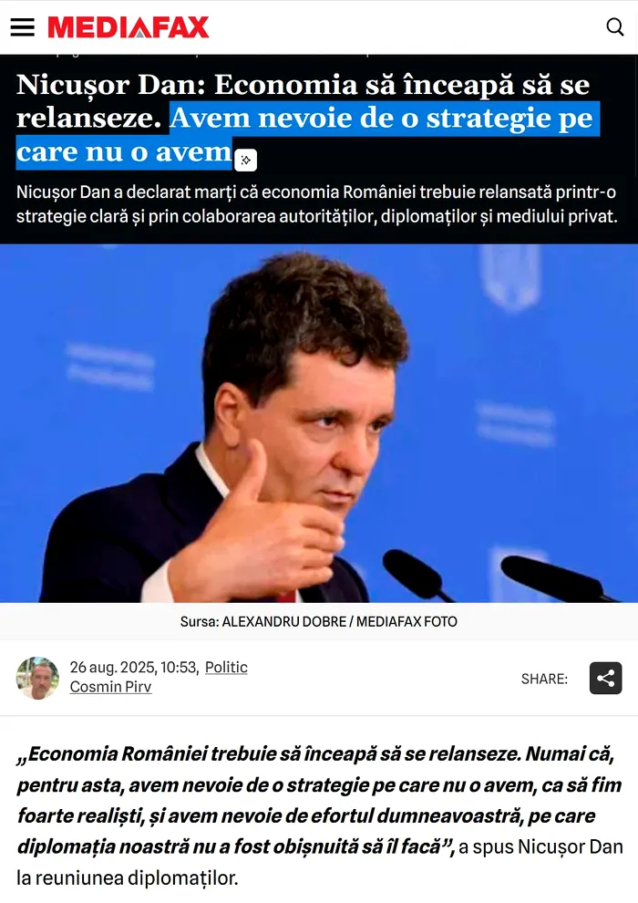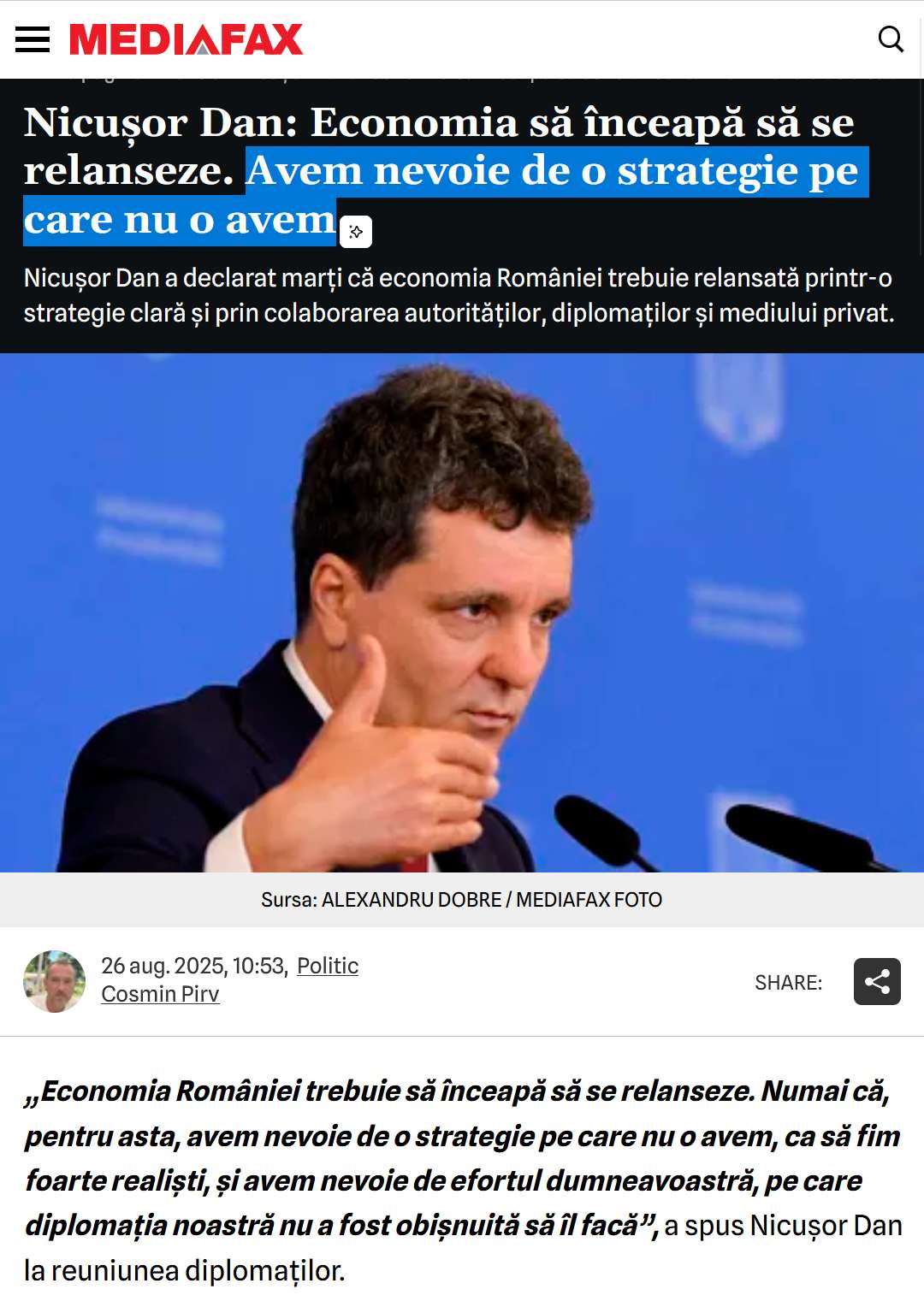 „Economia să înceapă să se relanseze. Avem nevoie de o strategie pe care nu o avem”, a spus Nicușor Dan în data de 26 august 2025.