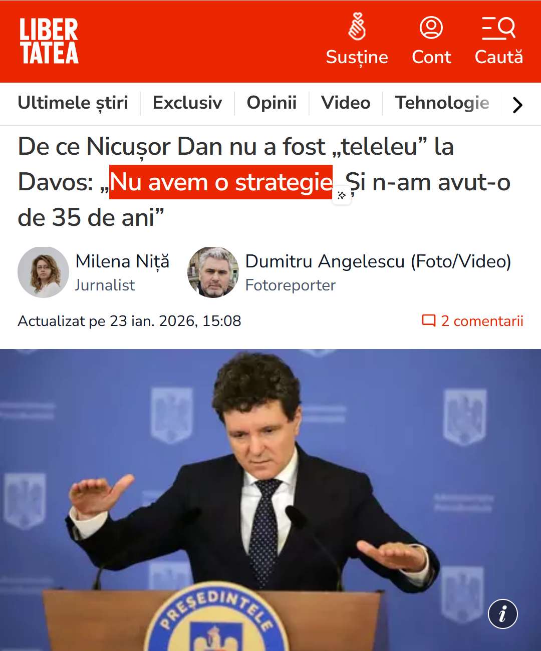 Prima pagină » Știri politice » Nicușor Dan își lansează proiectul de țară: O Românie fără strategie. Este răspunsul pe care președintele îl repetă obsesiv la întrebări din orice domeniu. Sănătate, dezvoltare, Davos, diplomație, economie… „N-avem strategie”