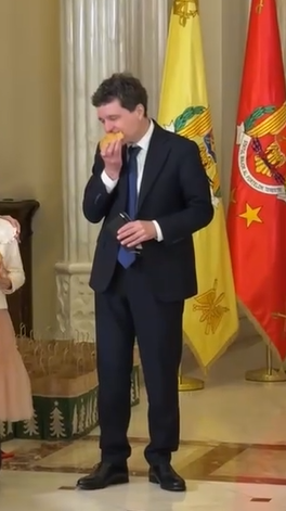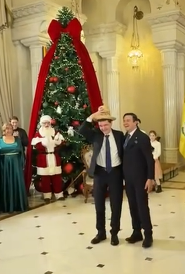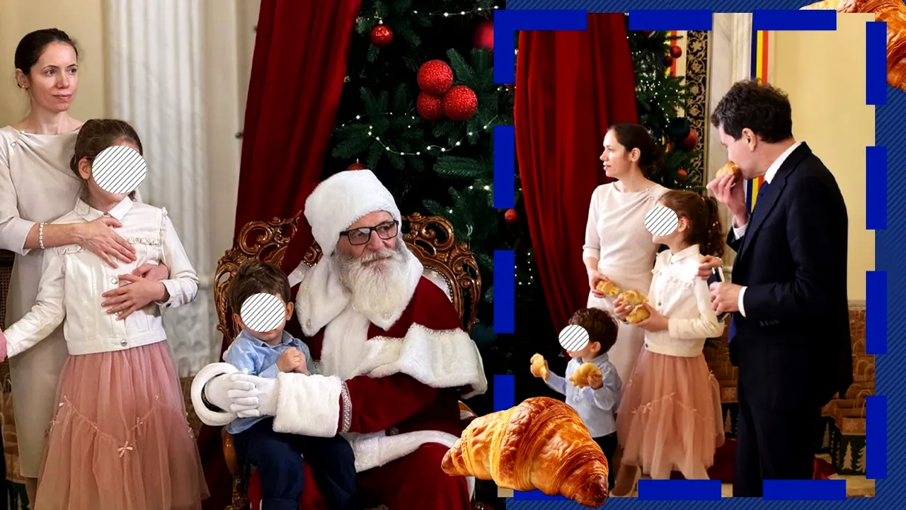 În timpul reprezentației de colinde din sala mare a Palatului Cotroceni, Nicușor Dan și familia sa au primit colaci tradiționali din partea artiștilor invitați. Președintele, fără să mai țină cont de nimic, a început să muște cu poftă din colăcei, asemenea, fiului său în vârstă de câțiva anișori.