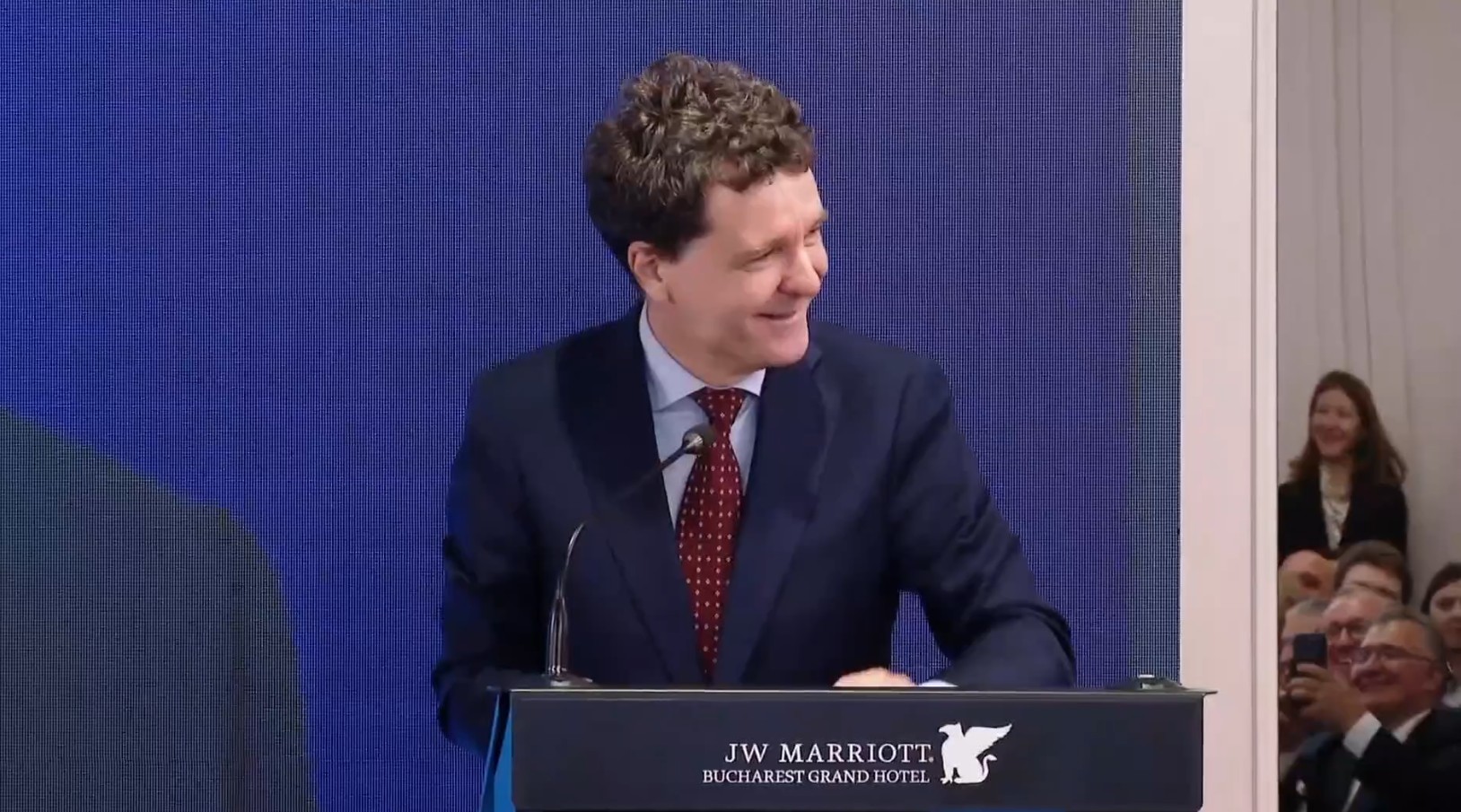 Președintele și-a continuat alocuțiunea cu greu, distrat de propria prestație. Momentul a contaminat și sala.