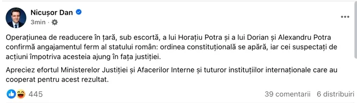 „Operațiunea de readucere în țară, sub escortă, a lui Horațiu Potra și a lui Dorian și Alexandru Potra confirmă angajamentul ferm al statului român: ordinea constituțională se apără, iar cei suspectați de acțiuni împotriva acesteia ajung în fața justiției. Apreciez efortul Ministerelor Justiției și Afacerilor Interne și tuturor instituțiilor internaționale care au cooperat pentru acest rezultat”, este mesajul postat de președintele României pe pagina sa de facebook.