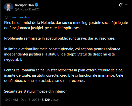 Președintele Nicușor Dan a transmis un mesaj chiar înainte de vizita în Finlanda, în care vorbește despre acuzațiile cu privire la independența justiției din România.