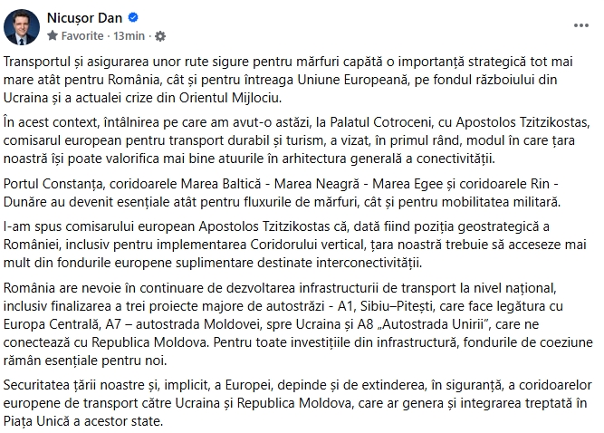 I-am spus comisarului european Apostolos Tzitzikostas că, dată fiind poziția geostrategică a României, inclusiv pentru implementarea Coridorului vertical, țara noastră trebuie să acceseze mai mult din fondurile europene suplimentare destinate interconectivității”, a transmis Nicușor Dan.