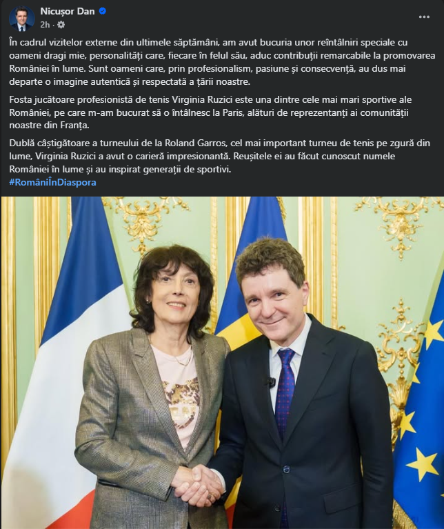Președintele Nicușor Dan a transmis vineri că, în timpul vizitei la Paris, din urmă cu trei săptămâni, s-a întâlnit și cu legendara jucătoare de tenis a României, Virginia Ruzici.