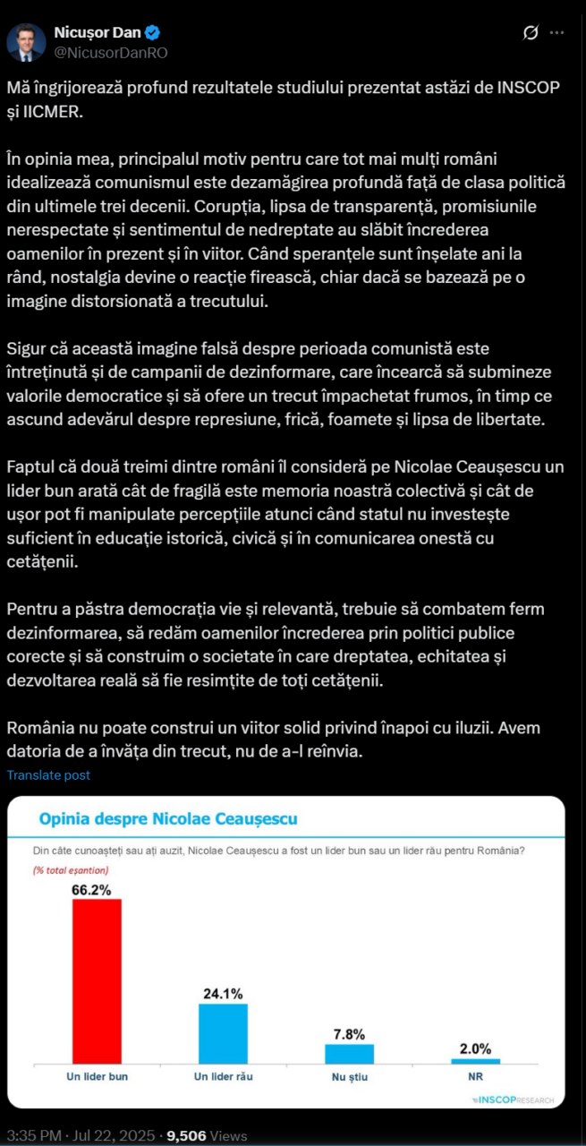 „Sigur că această imagine falsă despre perioada comunistă este întreținută și de campanii de dezinformare, care încearcă să submineze valorile democratice și să ofere un trecut împachetat frumos, în timp ce ascund adevărul despre represiune, frică, foamete și lipsa de libertate.Faptul că două treimi dintre români îl consideră pe Nicolae Ceaușescu un lider bun arată cât de fragilă este memoria noastră colectivă și cât de ușor pot fi manipulate percepțiile atunci când statul nu investește suficient în educație istorică, civică și în comunicarea onestă cu cetățenii.Pentru a păstra democrația vie și relevantă, trebuie să combatem ferm dezinformarea, să redăm oamenilor încrederea prin politici publice corecte și să construim o societate în care dreptatea, echitatea și dezvoltarea reală să fie resimțite de toți cetățenii.România nu poate construi un viitor solid privind înapoi cu iluzii. Avem datoria de a învăța din trecut, nu de a-l reînvia”.