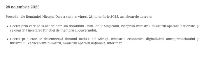 Președintele României, Nicușor Dan, a semnat decretul de eliberare din funcție a lui Ionuț Moșteanu. Totodată, l-a desemnat pe ministrul Economiei, Radu Miruță, în funcția de ministru interimar la Apărare.