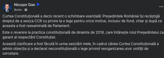Curtea Constituțională a României a luat o decizie importantă care schimbă regulile jocului între instituții. Mai exact, Președintele României poate sesiza CCR în legătură cu o lege pentru orice motiv, inclusiv pe fond, chiar și după ce Parlamentul a reanalizat-o. Decizia readuce practica de dinainte de 2018 și întărește rolul președintelui ca apărător al Constituției. Anunțul a fost făcut de Nicușor Dan, care a precizat că hotărârea Curții a venit în urma unei sesizări depuse de el.