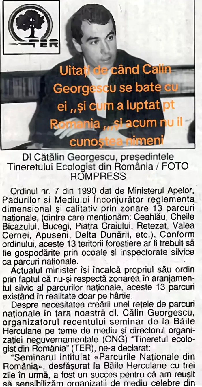 De pildă, în acea perioadă, Georgescu a criticat un ordin al ministrului Mediului care prevedea zonarea a 13 parcuri naturale, printre care Delta Dunării, Piatra Craiului, Retezat, Bucegi și Apuseni. Potrivit unui articol din presa vremii, autentificat de Gândul, el susținea că aceste parcuri existau doar pe hârtie și nu în realitate. Afirmațiile au fost făcute în urma participării la seminarul intitulat „Parcurile Naționale din România”, care s-a desfășurat la Băile Herculane.