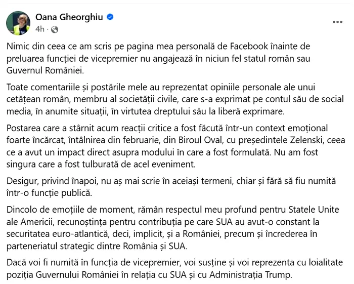 Oana Gheorghiu a reacționat miercuri, într-o postare pe Facebook. Ea a spus că că toate opiniile exprimate pe contul său personal de Facebook înainte de preluarea funcției de vicepremier „nu angajează în niciun fel statul român sau Guvernul României”.