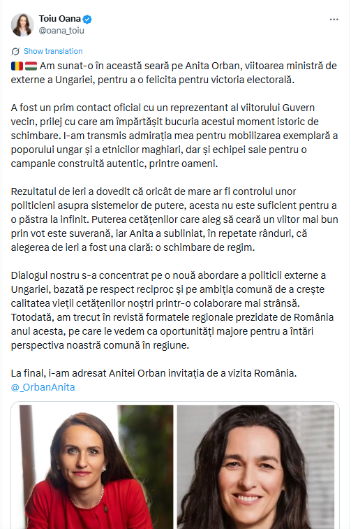 Oana Țoiu a contactat-o pe Anita Orban, viitoarea ministră de Externe și membră a partidului Tisza, pentru a o felicita pentru victoria de la parlamentare. Oana Țoiu a precizat că i-a adresat și o invitație de a vizita România.