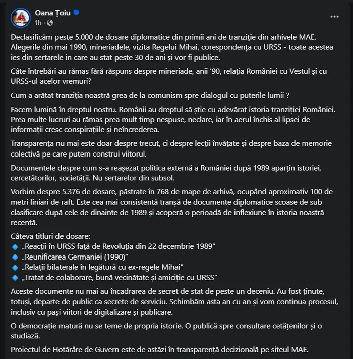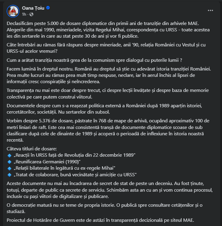”Declasificăm peste 5.000 de dosare diplomatice din primii ani de tranziție din arhivele MAE. Alegerile din mai 1990, mineriadele, vizita Regelui Mihai, corespondența cu URSS – toate acestea ies din sertarele in care au stat peste 30 de ani și vor fi publice” a anunțat Oana Țoiu, pe Facebook.