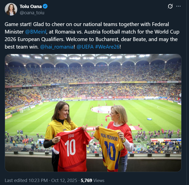 Oana Țoiu și Beate Meinl-Reisinger au fost pe Arena Națională, la partida România-Austria, câștigată de tricolori.