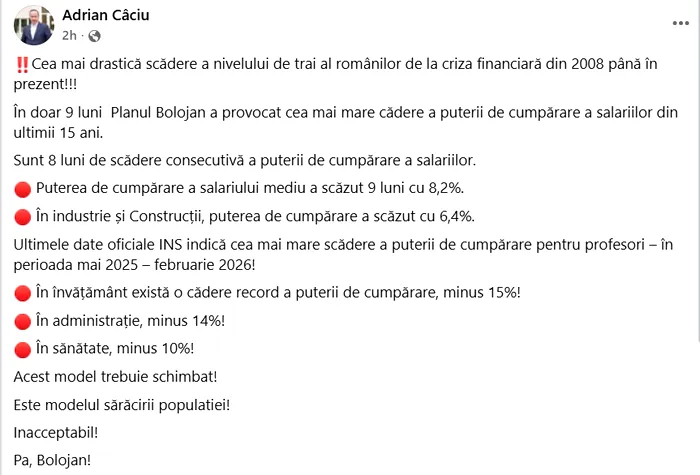 Practic, în doar 9 luni de mandat, politica implementată de Ilie Bolojan a provocat cea mai mare cădere a puterii de cumpărare a salariilor românilor din ultimii 15 ani, atrage atenția Câciu.