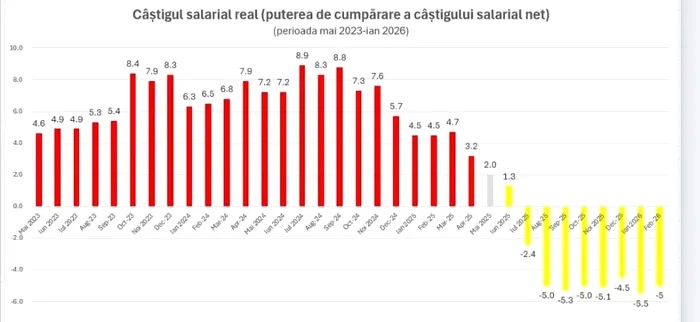 Sunt 8 luni de scădere consecutivă a puterii de cumpărare a salariilor.
