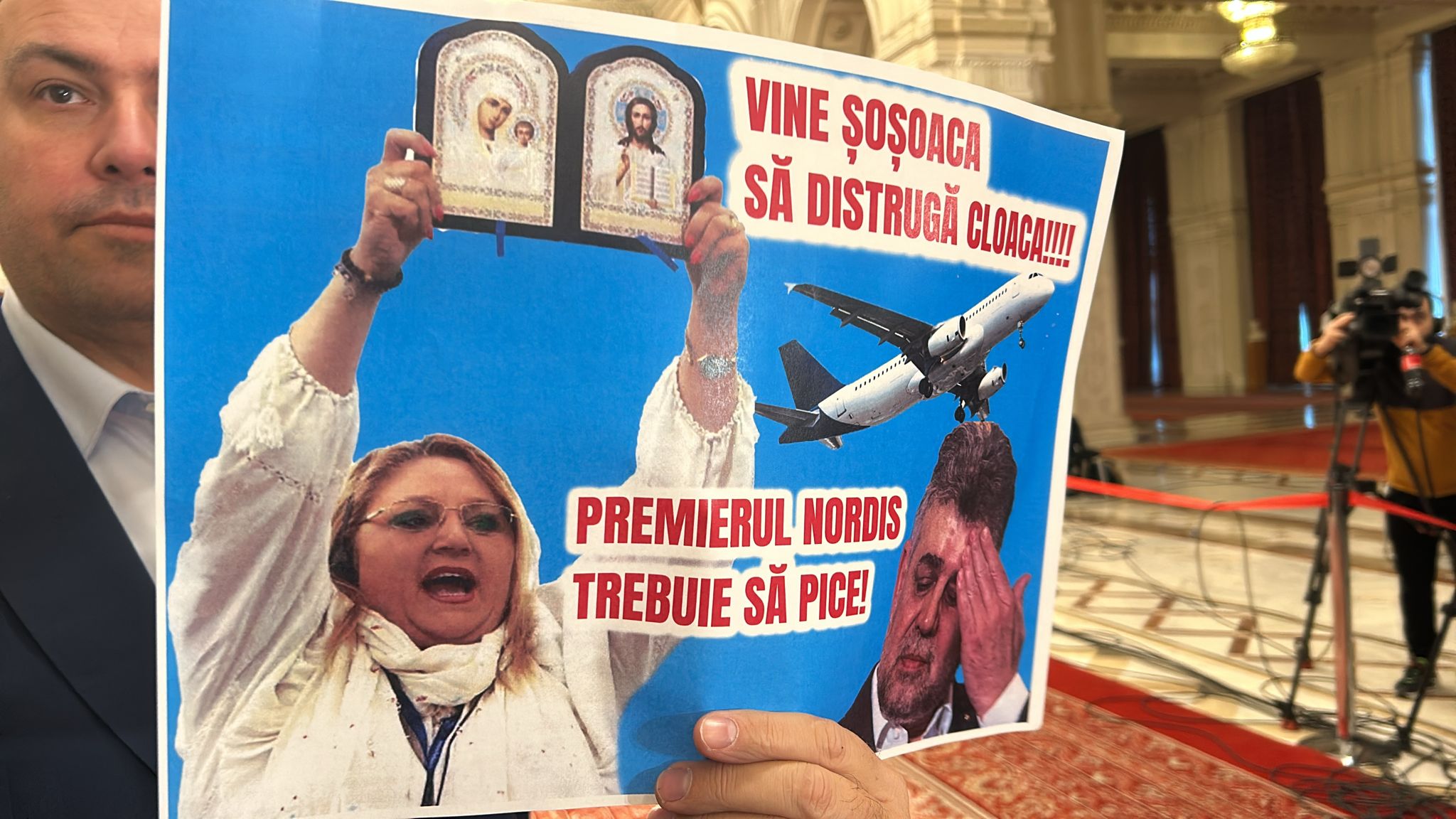 Diana Șoșoacă nu este la Parlamentul European, ci în Parlamentul României. Șefa SOS este pe culoarele Camerei Depunaților, unde spune că îl va demite pe Marcel Ciolacu.